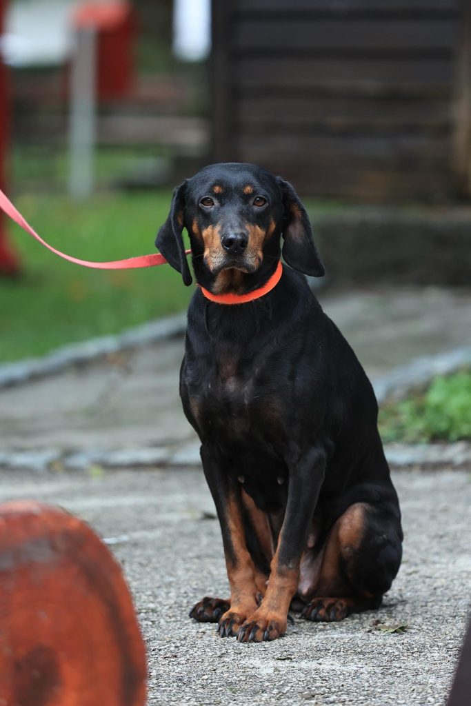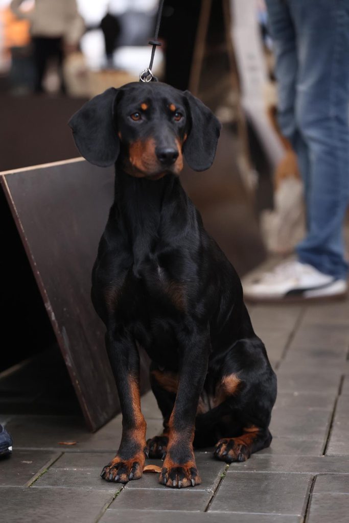 COLOUR : The basic colour is black with tan markings above the eyes, on the muzzle and on the lower parts of the legs. The tan markings above the eyes are the size of a hazelnut, whereas the ones on the lateral parts of the muzzle extend at maximum to the corner of the lips. The colour of the tan markings goes from a light red through a brownish red to a bright red. A white spot on the chest is admitted but not sought after; its diameter must not be more than 3 cm.